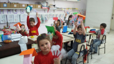 A turma do Pré II da professora Elizandra, realizou uma atividade envolvendo o Projeto "Atitude Cidadã" e a história "Os Três Porquinhos". Os alunos fizeram as casinhas reutilizando caixas de leite e fantoches de palitos dos personagens.